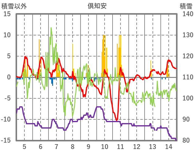 | 日 | 時 | 気温 | 降水 | 風向/風速 | 日照 | 積雪 | 降雪 |