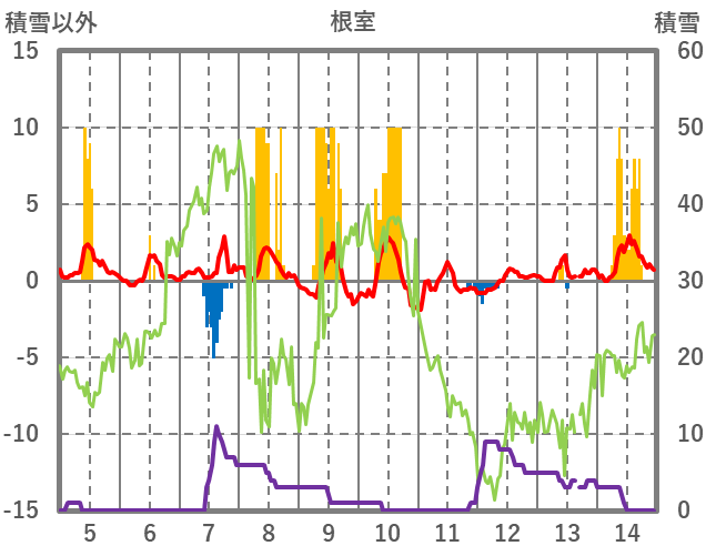 | 日 | 時 | 気温 | 降水 | 風向/風速 | 日照 | 積雪 | 降雪 |