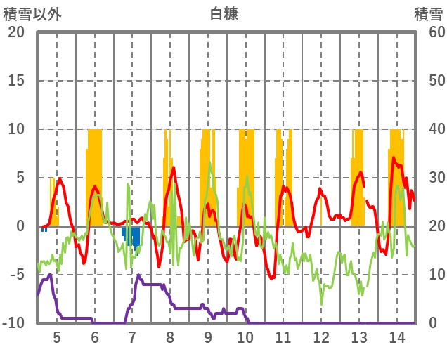 | 日 | 時 | 気温 | 降水 | 風向/風速 | 日照 | 積雪 | 降雪 |