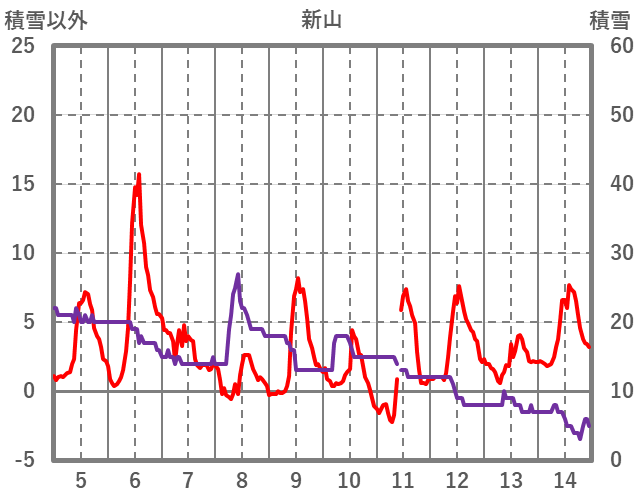 | 日 | 時 | 気温 | 降水 | 風向/風速 | 日照 | 積雪 | 降雪 |