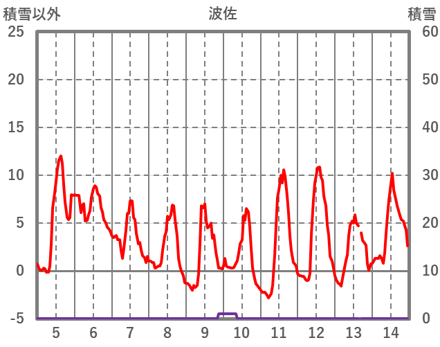 | 日 | 時 | 気温 | 降水 | 風向/風速 | 日照 | 積雪 | 降雪 |