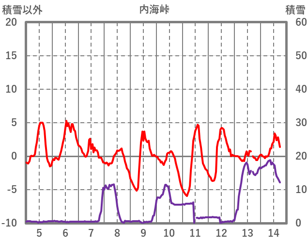 | 日 | 時 | 気温 | 降水 | 風向/風速 | 日照 | 積雪 | 降雪 |