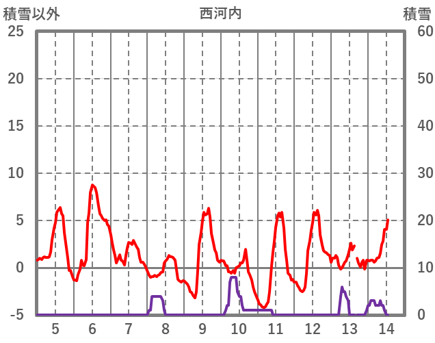 | 日 | 時 | 気温 | 降水 | 風向/風速 | 日照 | 積雪 | 降雪 |
