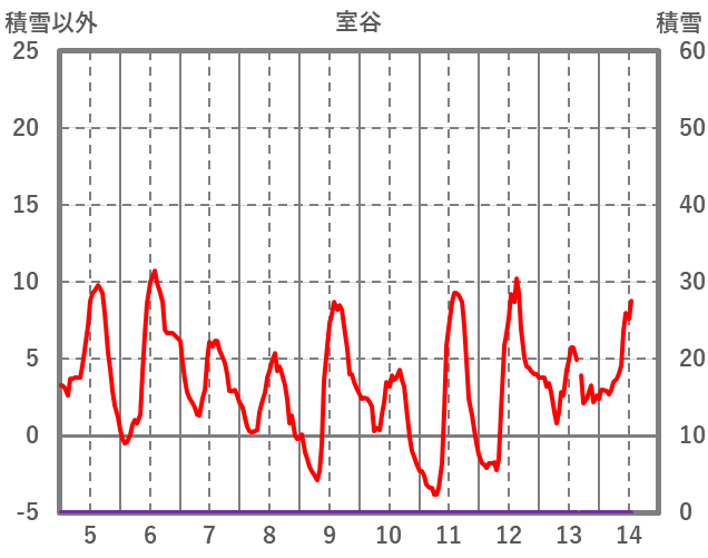 | 日 | 時 | 気温 | 降水 | 風向/風速 | 日照 | 積雪 | 降雪 |