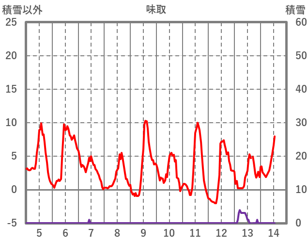| 日 | 時 | 気温 | 降水 | 風向/風速 | 日照 | 積雪 | 降雪 |