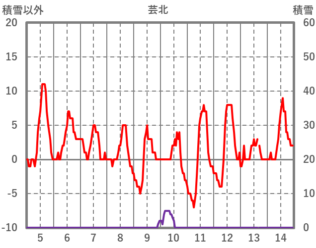 | 日 | 時 | 気温 | 降水 | 風向/風速 | 日照 | 積雪 | 降雪 |
