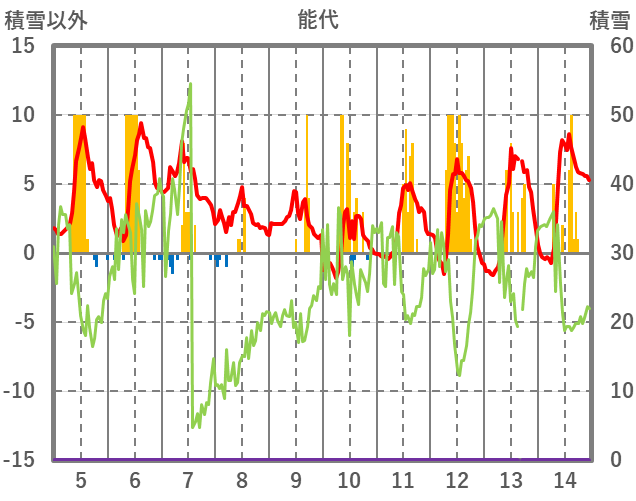 | 日 | 時 | 気温 | 降水 | 風向/風速 | 日照 | 積雪 | 降雪 |