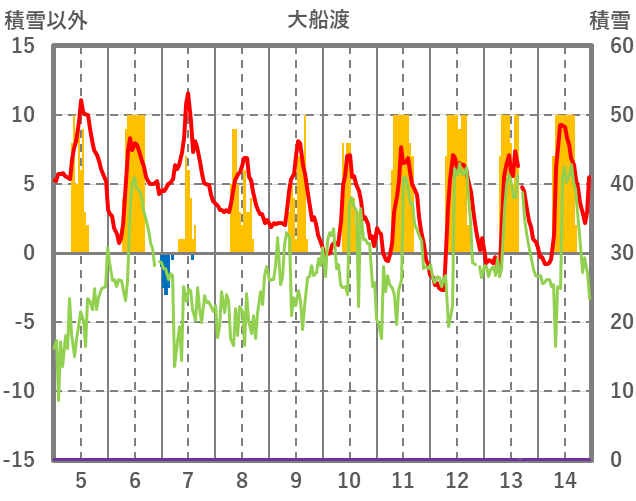 | 日 | 時 | 気温 | 降水 | 風向/風速 | 日照 | 積雪 | 降雪 |