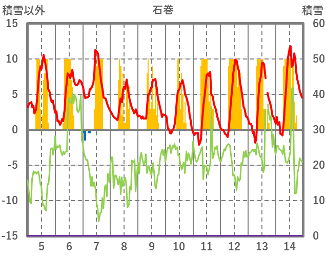 | 日 | 時 | 気温 | 降水 | 風向/風速 | 日照 | 積雪 | 降雪 |