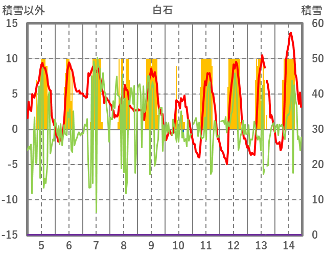| 日 | 時 | 気温 | 降水 | 風向/風速 | 日照 | 積雪 | 降雪 |