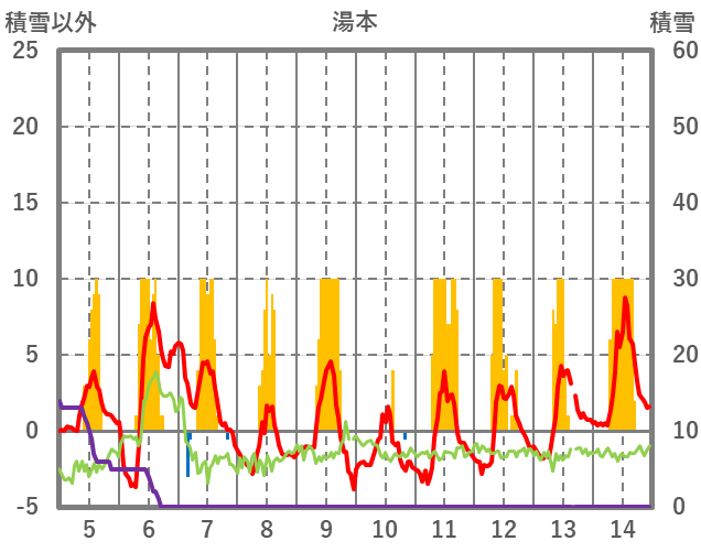 | 日 | 時 | 気温 | 降水 | 風向/風速 | 日照 | 積雪 | 降雪 |