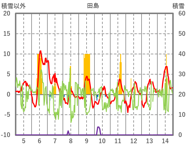 | 日 | 時 | 気温 | 降水 | 風向/風速 | 日照 | 積雪 | 降雪 |