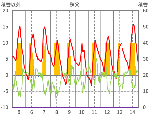 | 日 | 時 | 気温 | 降水 | 風向/風速 | 日照 | 積雪 | 降雪 |