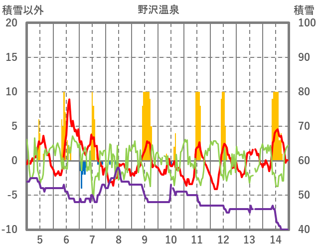 | 日 | 時 | 気温 | 降水 | 風向/風速 | 日照 | 積雪 | 降雪 |