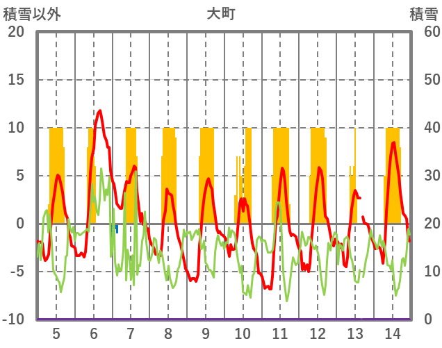 | 日 | 時 | 気温 | 降水 | 風向/風速 | 日照 | 積雪 | 降雪 |
