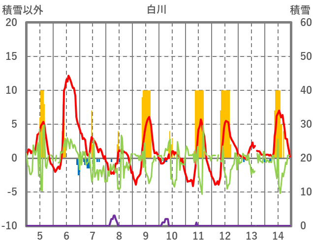| 日 | 時 | 気温 | 降水 | 風向/風速 | 日照 | 積雪 | 降雪 |