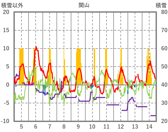 | 日 | 時 | 気温 | 降水 | 風向/風速 | 日照 | 積雪 | 降雪 |