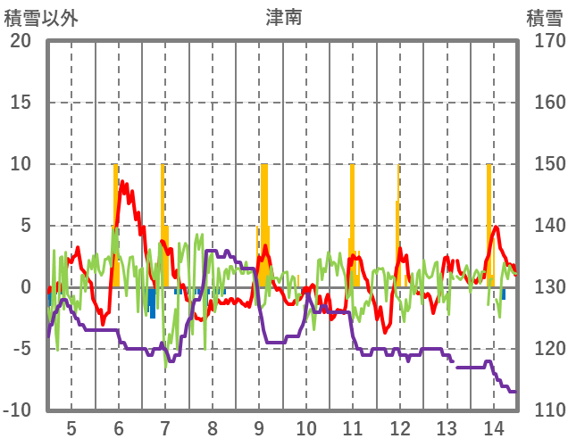 | 日 | 時 | 気温 | 降水 | 風向/風速 | 日照 | 積雪 | 降雪 |