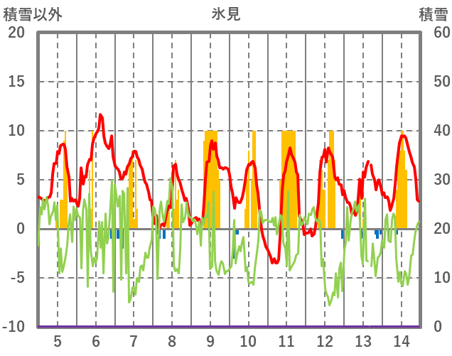 | 日 | 時 | 気温 | 降水 | 風向/風速 | 日照 | 積雪 | 降雪 |