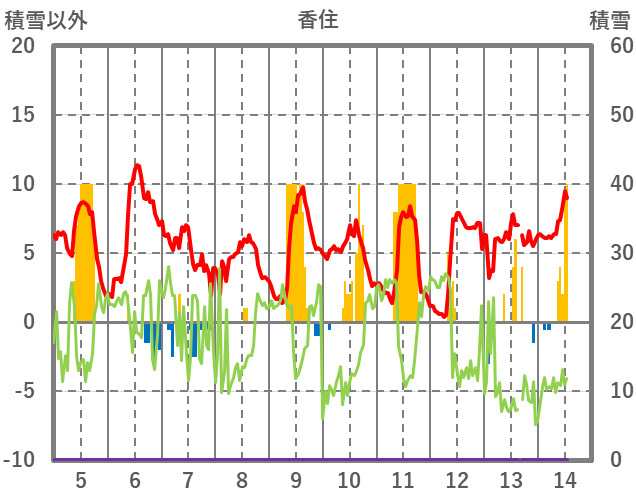 | 日 | 時 | 気温 | 降水 | 風向/風速 | 日照 | 積雪 | 降雪 |