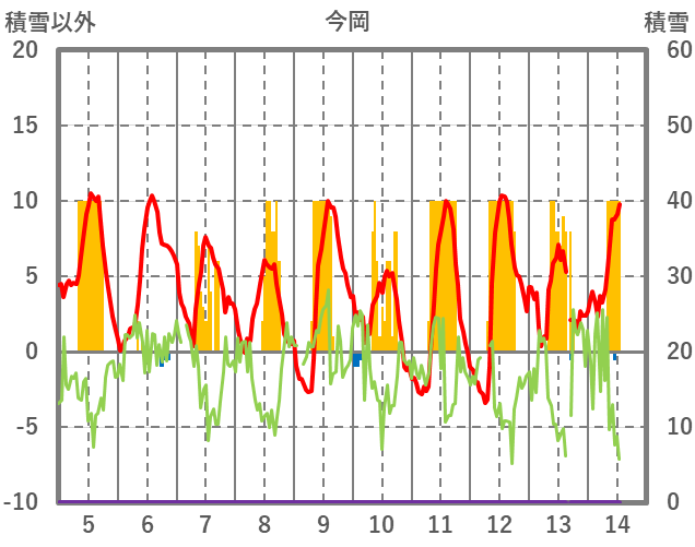 | 日 | 時 | 気温 | 降水 | 風向/風速 | 日照 | 積雪 | 降雪 |