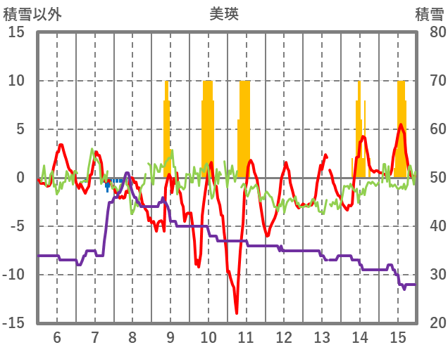 | 日 | 時 | 気温 | 降水 | 風向/風速 | 日照 | 積雪 | 降雪 |