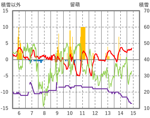 | 日 | 時 | 気温 | 降水 | 風向/風速 | 日照 | 積雪 | 降雪 |
