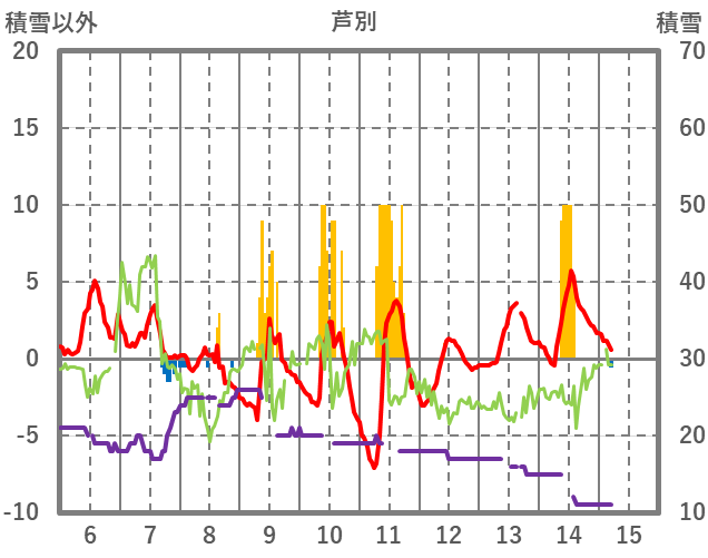 | 日 | 時 | 気温 | 降水 | 風向/風速 | 日照 | 積雪 | 降雪 |