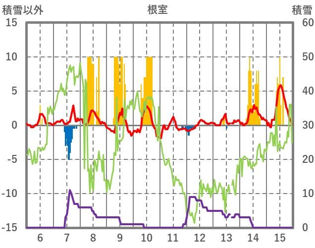 | 日 | 時 | 気温 | 降水 | 風向/風速 | 日照 | 積雪 | 降雪 |