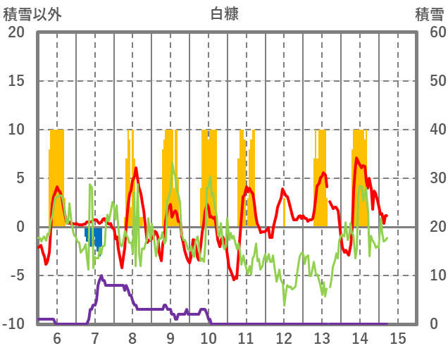 | 日 | 時 | 気温 | 降水 | 風向/風速 | 日照 | 積雪 | 降雪 |