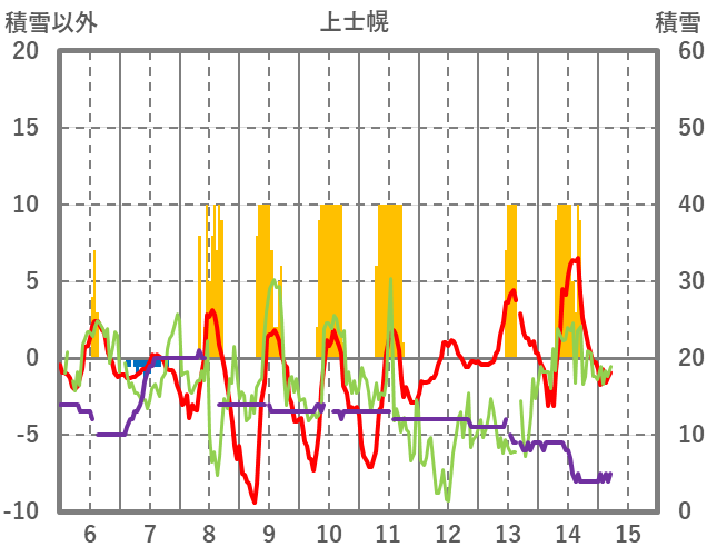 | 日 | 時 | 気温 | 降水 | 風向/風速 | 日照 | 積雪 | 降雪 |
