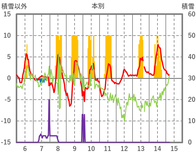 | 日 | 時 | 気温 | 降水 | 風向/風速 | 日照 | 積雪 | 降雪 |