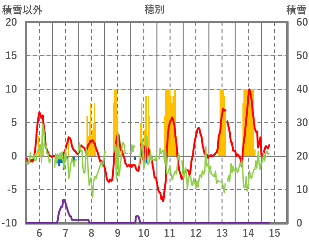 | 日 | 時 | 気温 | 降水 | 風向/風速 | 日照 | 積雪 | 降雪 |