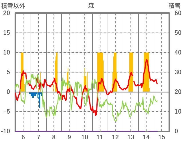 | 日 | 時 | 気温 | 降水 | 風向/風速 | 日照 | 積雪 | 降雪 |
