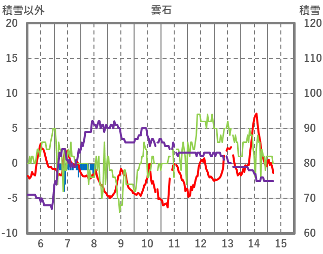 | 日 | 時 | 気温 | 降水 | 風向/風速 | 日照 | 積雪 | 降雪 |