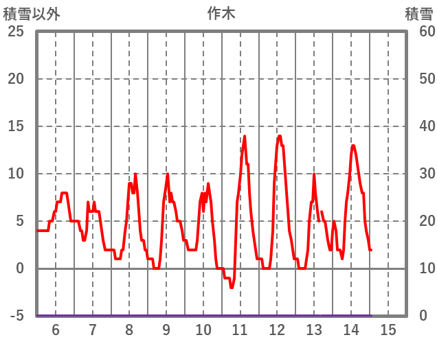 | 日 | 時 | 気温 | 降水 | 風向/風速 | 日照 | 積雪 | 降雪 |