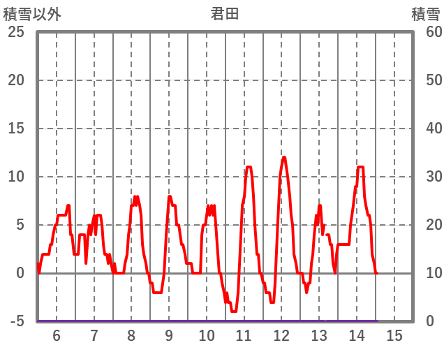 | 日 | 時 | 気温 | 降水 | 風向/風速 | 日照 | 積雪 | 降雪 |