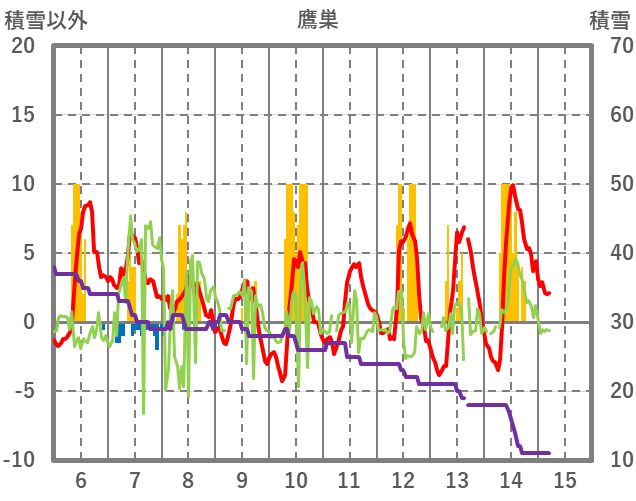 | 日 | 時 | 気温 | 降水 | 風向/風速 | 日照 | 積雪 | 降雪 |