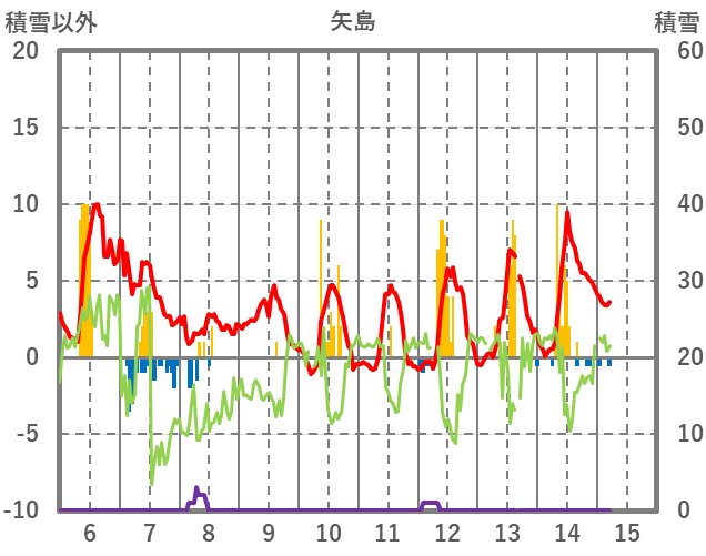 | 日 | 時 | 気温 | 降水 | 風向/風速 | 日照 | 積雪 | 降雪 |