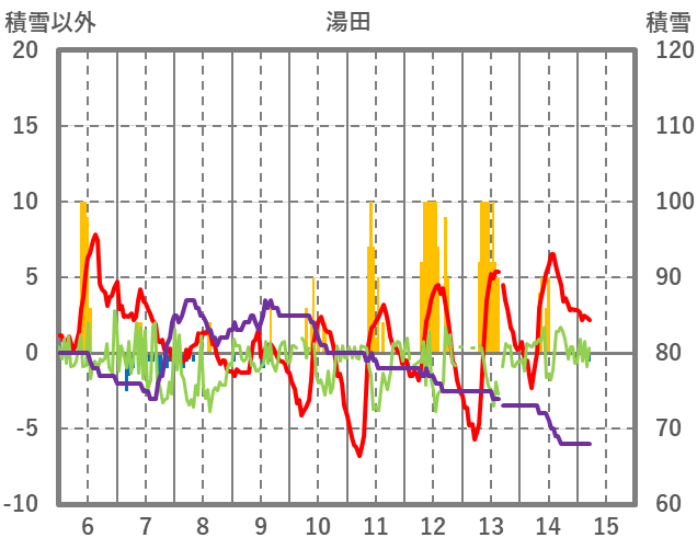 | 日 | 時 | 気温 | 降水 | 風向/風速 | 日照 | 積雪 | 降雪 |