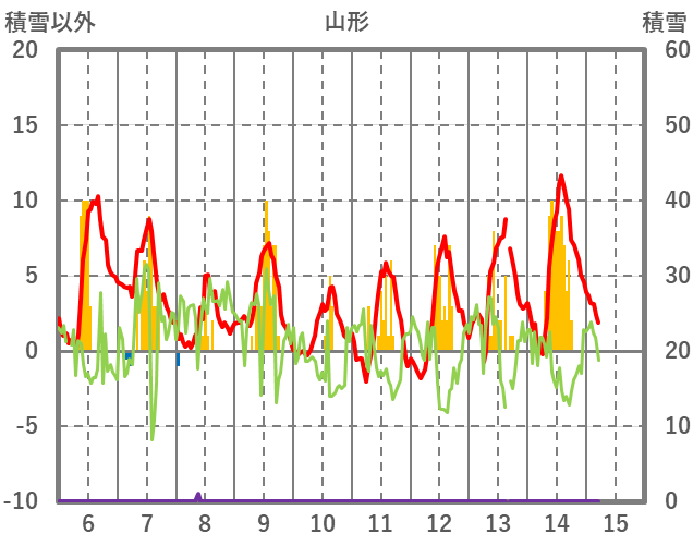 | 日 | 時 | 気温 | 降水 | 風向/風速 | 日照 | 積雪 | 降雪 |