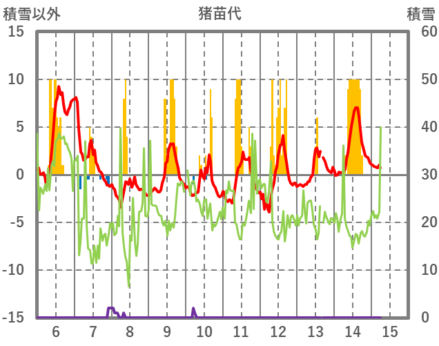 | 日 | 時 | 気温 | 降水 | 風向/風速 | 日照 | 積雪 | 降雪 |
