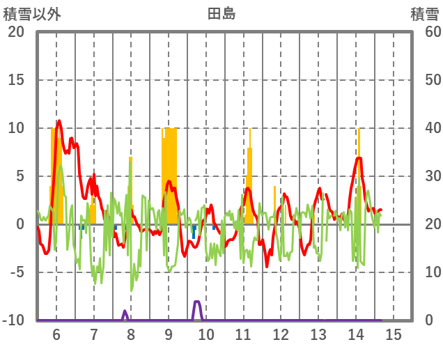 | 日 | 時 | 気温 | 降水 | 風向/風速 | 日照 | 積雪 | 降雪 |