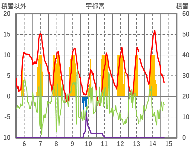 | 日 | 時 | 気温 | 降水 | 風向/風速 | 日照 | 積雪 | 降雪 |