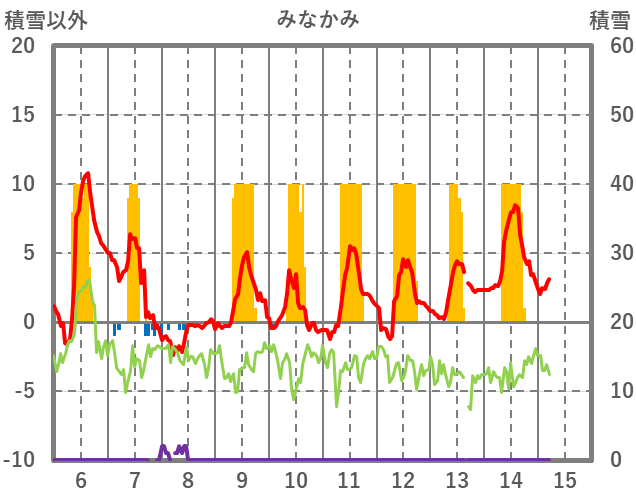 | 日 | 時 | 気温 | 降水 | 風向/風速 | 日照 | 積雪 | 降雪 |