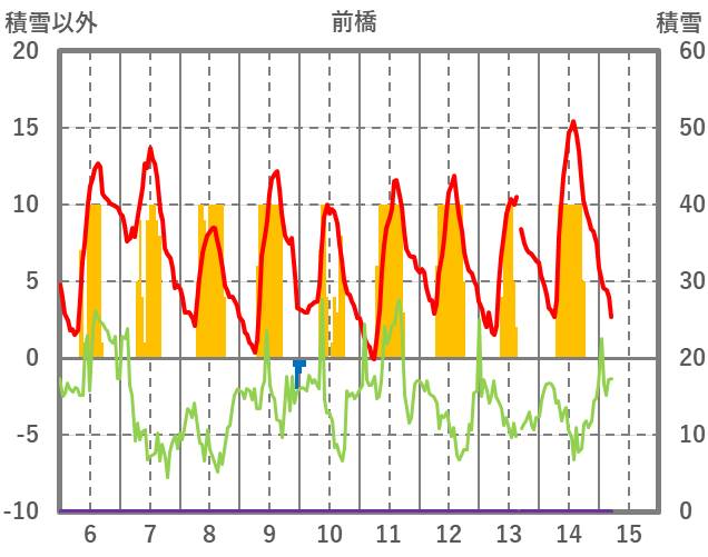 | 日 | 時 | 気温 | 降水 | 風向/風速 | 日照 | 積雪 | 降雪 |
