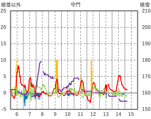| 日 | 時 | 気温 | 降水 | 風向/風速 | 日照 | 積雪 | 降雪 |
