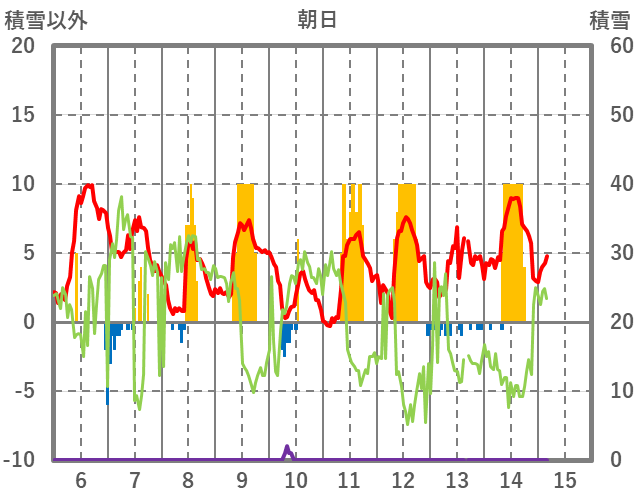 | 日 | 時 | 気温 | 降水 | 風向/風速 | 日照 | 積雪 | 降雪 |