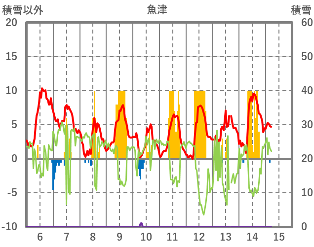 | 日 | 時 | 気温 | 降水 | 風向/風速 | 日照 | 積雪 | 降雪 |