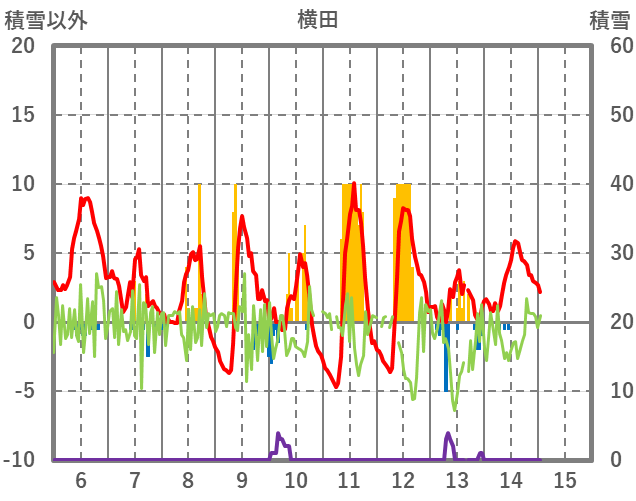 | 日 | 時 | 気温 | 降水 | 風向/風速 | 日照 | 積雪 | 降雪 |